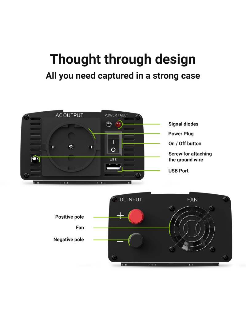 Dzięki przemyślanej konstrukcji użytkowanie przetwornicy napięcia jest łatwe, bezpieczne i komfortowe.Z przodu przetwornicy - w zalezności od modelu - znajduje się jedno lub kilka gniazd sieciowych, dostosowanych do najbardziej popularnej europejskiej wtyczki schukoDzięki temu przetwornicę można wykorzystać do zasilania różnorakich urządzeń elektrycznych - od smartfonów po podkaszarkę, elektronarzędzia, myjkę ciśnieniową i wiele innych.