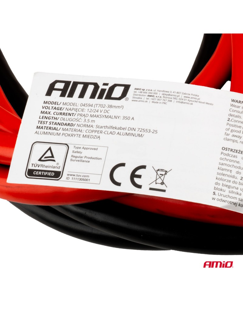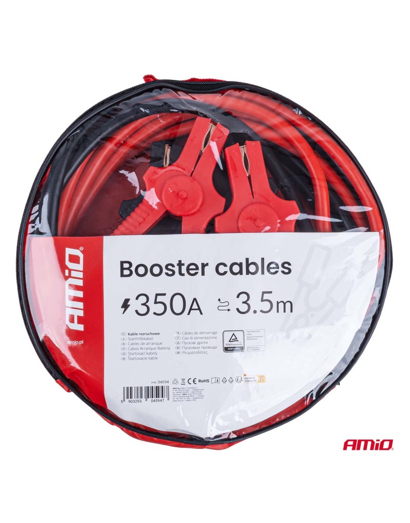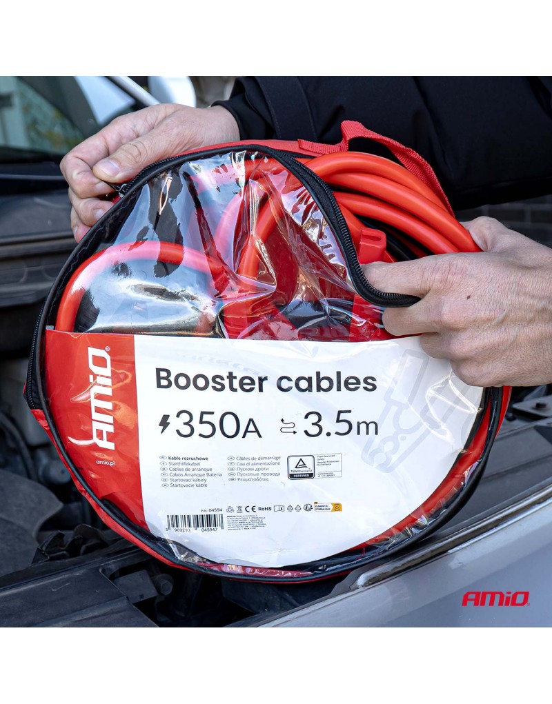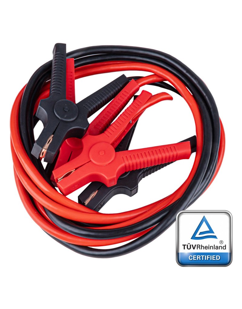 Wysokiej jakości kable rozruchowe o prądzie maksymalnym 350A i długości 3,5 metra, przeznaczone do awaryjnego uruchamiania pojazdów z akumulatorami 12V i 24V. Produkt posiada certyfikat TÜV, który potwierdza zgodność z wymaganiami bezpieczeństwa oraz trwałość wykonania.