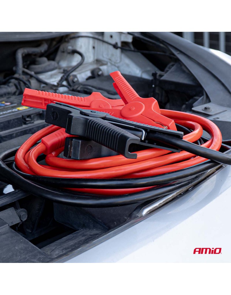 Przewody wykonane są z elastycznej linki miedziowanej o przekroju 38,5 mm² i średnicy 12 mm, co zapewnia niski opór i skuteczne przewodzenie prądu nawet w trudnych warunkach pogodowych. Mocne, izolowane szczęki z solidnymi sprężynami gwarantują pewne i bezpieczne połączenie z biegunami akumulatora.