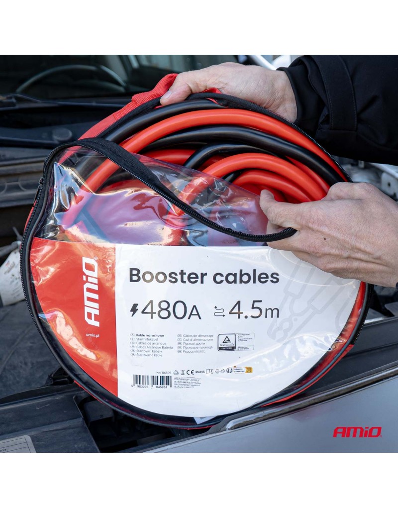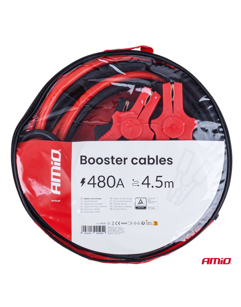 Profesjonalne kable rozruchowe o maksymalnym prądzie 480A i długości 4,5 metra, przeznaczone do awaryjnego uruchamiania pojazdów z akumulatorami 12V i 24V. Produkt posiada certyfikaty TÜV/GS, które gwarantują bezpieczeństwo użytkowania oraz wysoką jakość wykonania.