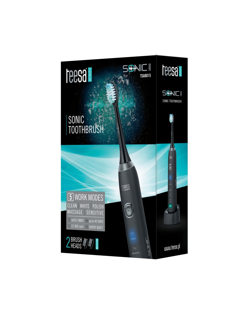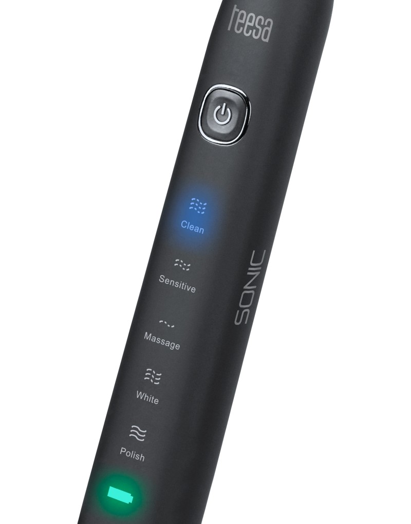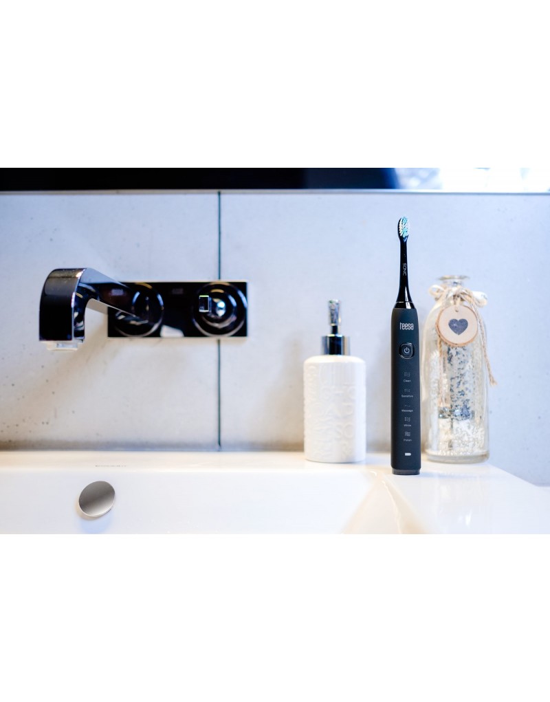 Przekonaj się o skuteczności technologii sonicznej! Szczoteczka Teesa SONIC Black wykonuje kilkakrotnie więcej ruchów na minutę w porównaniu do obrotowej szczoteczki elektrycznej. Oznacza to, że znacznie dokładniej usuwa płytkę nazębną oraz oczyszcza przestrzenie między zębami.