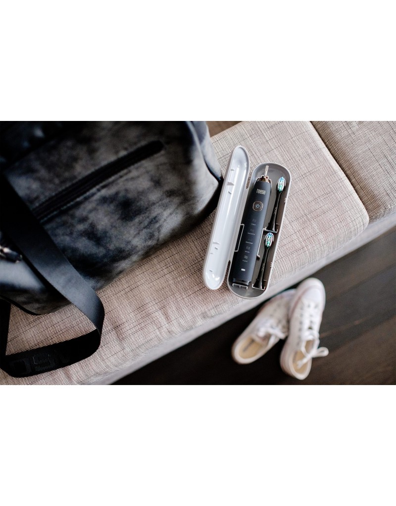 Nie zabierasz w podróż szczoteczki sonicznej, bo boisz się, że urządzenie uszkodzi się w walizce? Teraz to nie jest problem! Wraz ze szczoteczką SONIC Black otrzymujesz podróżne etui, dzięki któremu będziesz mógł zabierać szczoteczkę zawsze ze sobą i dbać o swój uśmiech tam, gdzie chcesz.