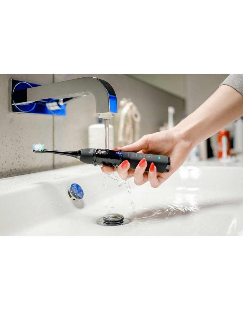 Jeśli chcesz jeszcze lepiej zadbać o zdrowie swojej jamy ustnej szczoteczka soniczna SONIC Black jest właśnie dla Ciebie! Wykorzystując ruch wymiatająco-pulsacyjny, urządzenie starannie usuwa osad i przebarwienia, nie powodując nadmiernego wycierania szkliwa oraz recesji dziąseł.