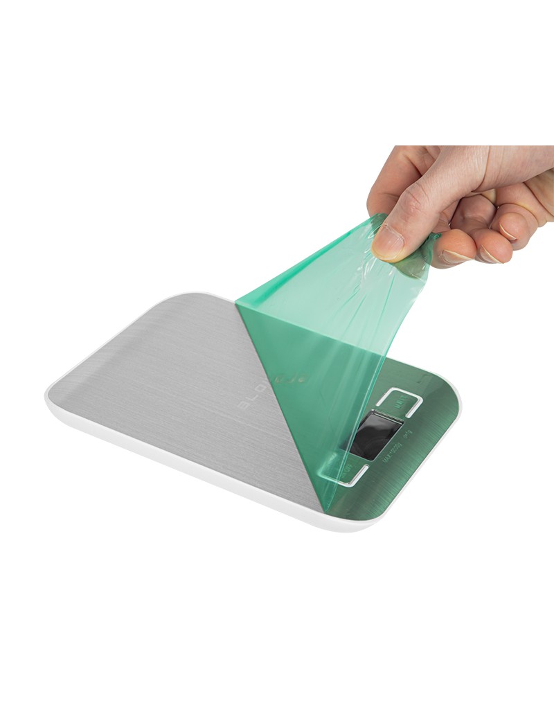 Przed pierwszym użyciem wagi kuchennej Blow KS202, prosimy o dokładne zdjęcie ochronnej folii, która znajduje się na górnej powierzchni urządzenia. Folia ta, w kolorze zielonym, ma za zadanie chronić wagę przed zarysowaniami i innymi uszkodzeniami podczas transportu oraz przechowywania. Po usunięciu folii, kolor wagi zmieni się na właściwy, metaliczny odcień, zgodny z wyglądem na opakowaniu.