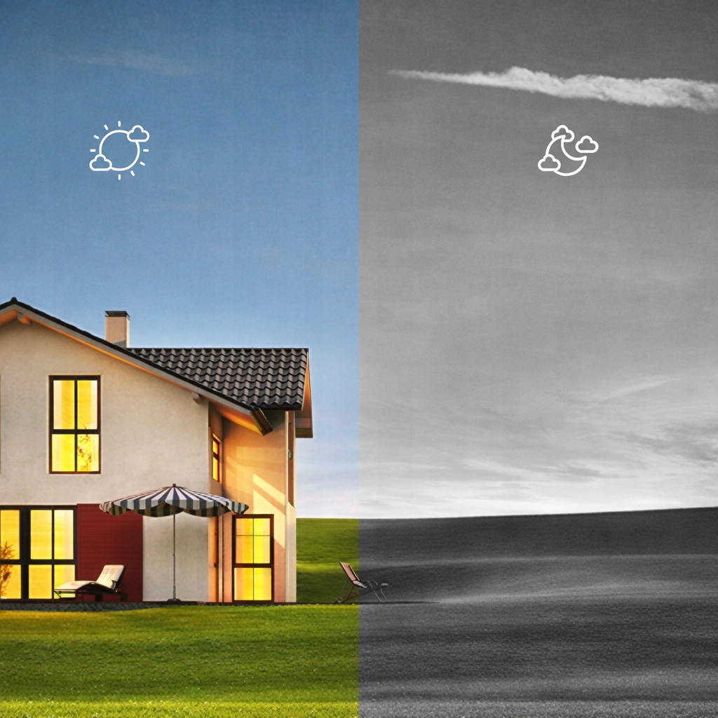 W ciągu nocy, dzięki podczerwieni (IR), automatycznie przełącza się w tryb nocny, umożliwiając widzenie w ciemności.